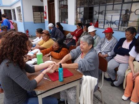 Das Team mit 21 jungen Heilsarmeemitgliedern( Salutisten) kam am 31. Dezember 2011 hier in Quito an, für 1 Woche hatten sie sich bereit erklärt, sich einzusetzen, wo es es nötig ist. Mit Joe, dem Koordinator, hatten wir La Colmena ausgewählt, ein Heilsarmeezentrum mit Kinderprogramm und dem Projekt der alten Leute. Es berührte uns sehr, mit welcher Begeisterung sich diese jungen Menschen einsetzten. An einem Tag wurden die Räume im Zentrum geputzt und Tische und Stühle neu gestrichen. An dem Tag mit den älteren Leuten, war ein Beautytag geplant. So wurde ihnen die Haare gewaschen und geschnitten, die Nägel geschnitten und bemalt, und sogar die Füsse wurden ihnen gewaschen. Die Jungen fanden sich nicht zu schade, dies zu tun. Es wurde auch sehr geschätzt. Es wurde dabei gesungen, Hand und Fussmassage gemacht, sodass es eine ganz entspannte Atmosphäre ergab. Am selben Nachmittag wurden in Gruppen einige Abuelitos besucht. Das war etwas vom Eindrücklichsten für diese jungen Amerikaner. Diese Armut, diese Bescheidenheit, dieser Schmutz, diese Not!! So etwas hatten sie noch nie gesehen. Auch wir, Bobesch und ich, die wir doch schon Einiges gesehen hatten, waren betroffen von dieser Armut.